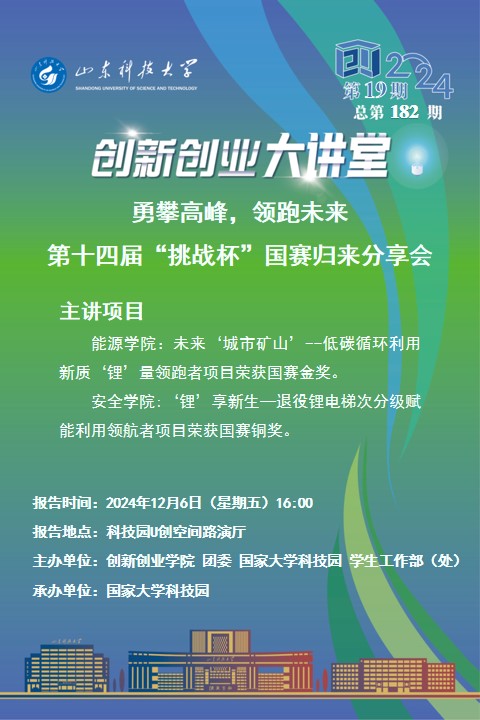 创新创业大讲堂2024年第19期:勇攀高峰,领跑未来 第十四届“挑战杯”国赛归来分享会